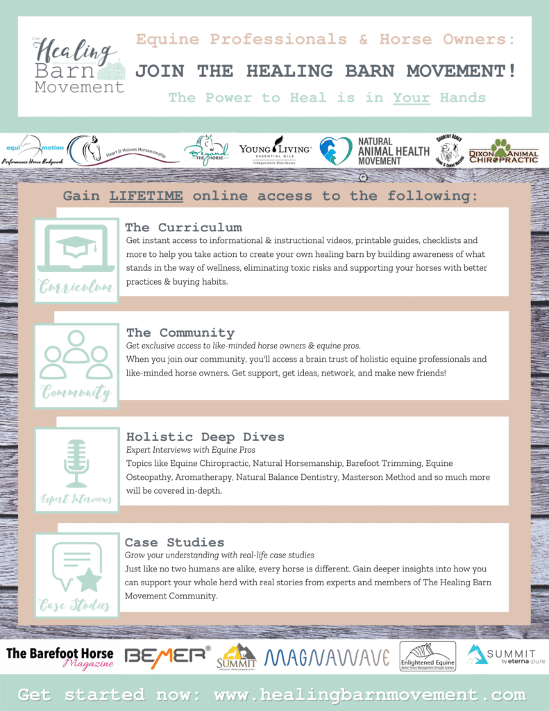 The Healing Barn Movement is a holistic resource center for creating a healing barn. When you join our community, you’ll access a brain trust of holistic equine professionals and like-minded horse owners. Get support, get ideas, network, access to holistic equine professional interviews, case studies and make new friends!