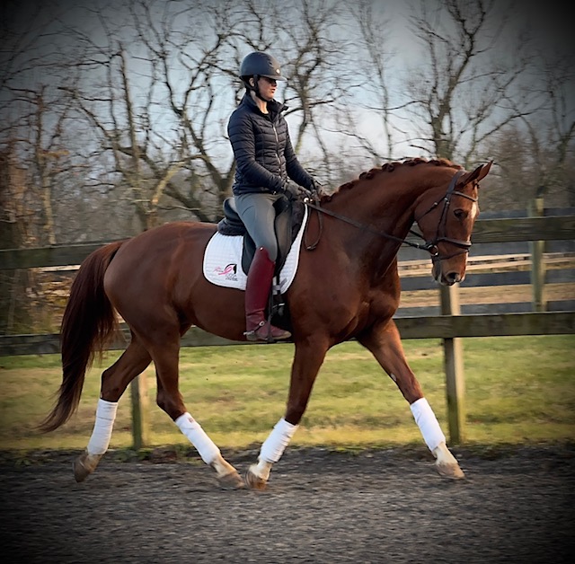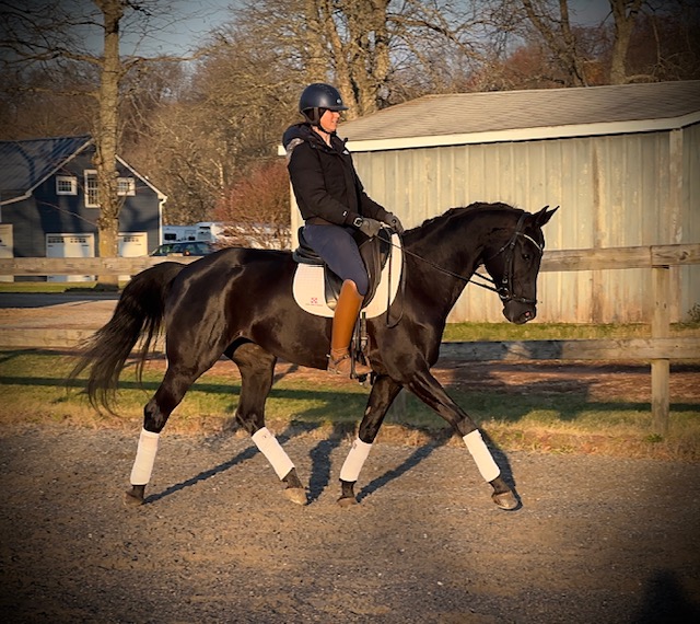 Duc is a super sweet chill small tour professor who is ready to help snag your silver medal! He is laid back and not spooky without being lazy or needing too much leg. He is fancy enough without being difficult or uncomfortable to sit. His canter is a dream! Easy changes and lateral work that’s like butter. He has the easiest pirouettes we’ve had the privilege of riding in a long time! He loves to hack alone or in a group and is not looking for things to spook at without being a complete deadhead. He has scores to 70% at Fourth level and is currently ready for PSG/I-1. No vices, health, or soundness issues. A lovely sweet schoolmaster with a kind Labrador personality. A true pleasure to ride and work with.