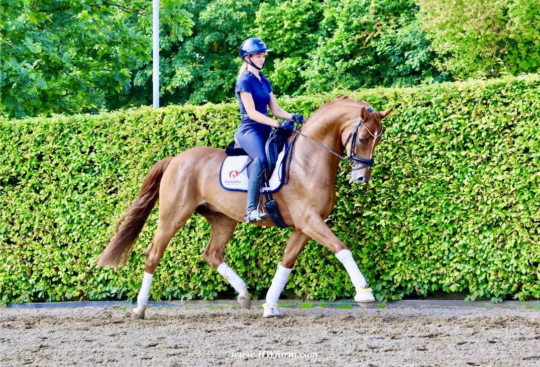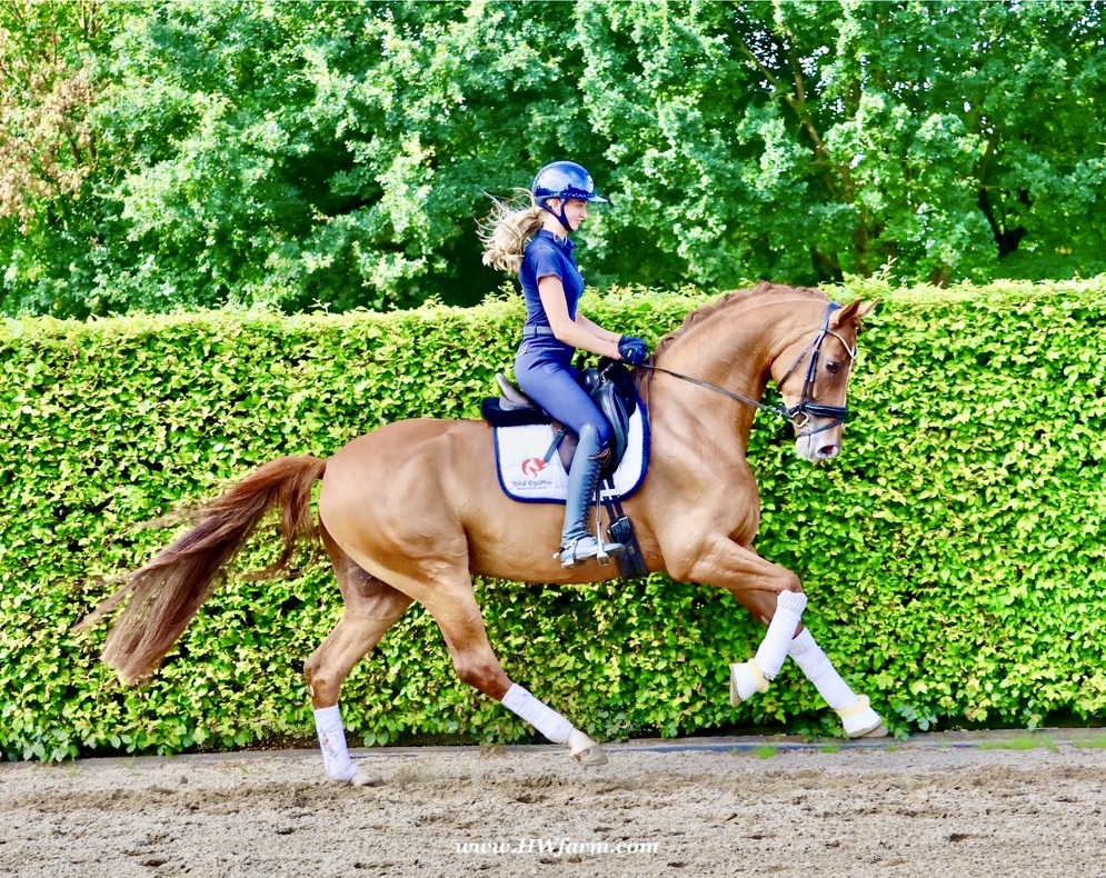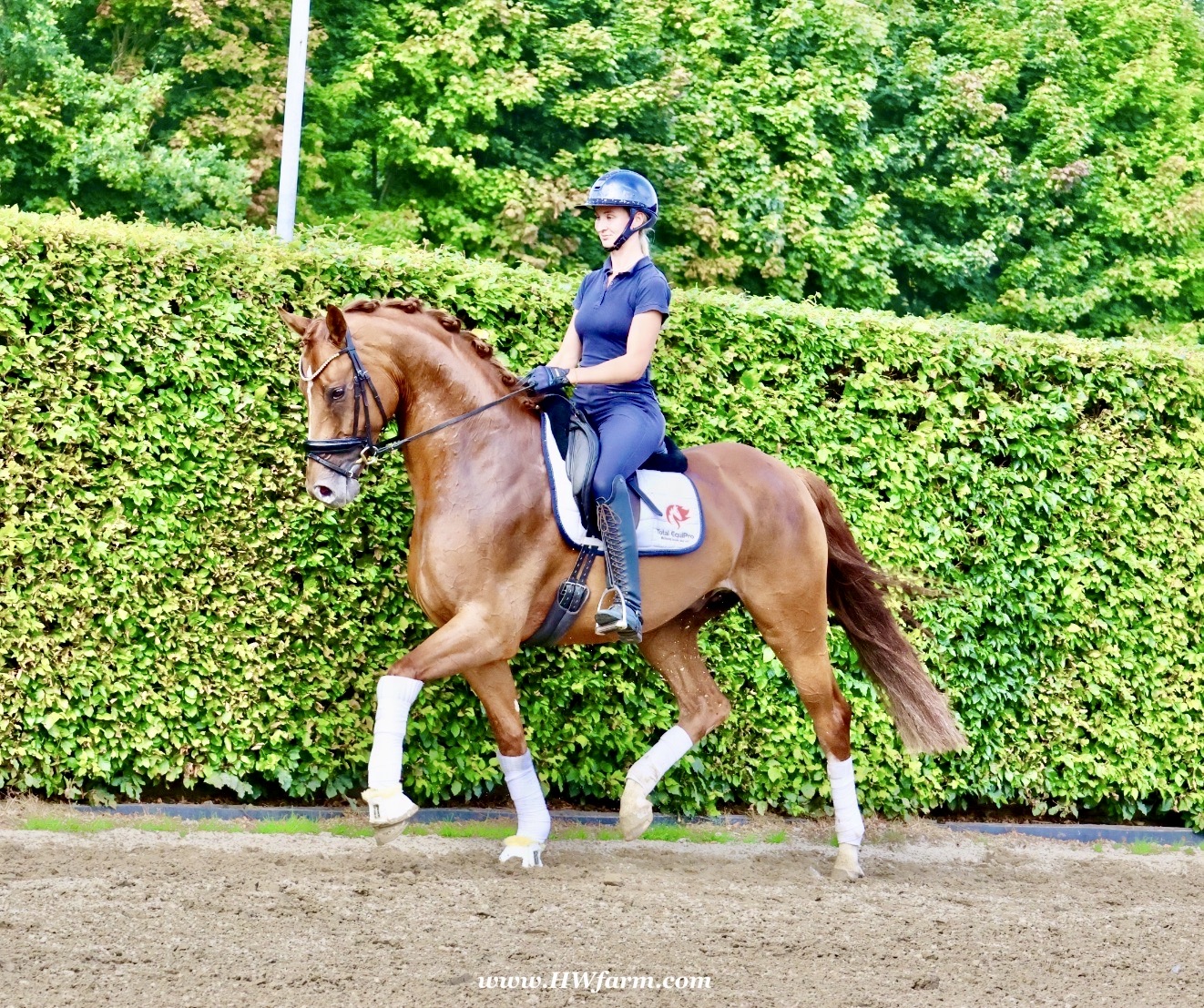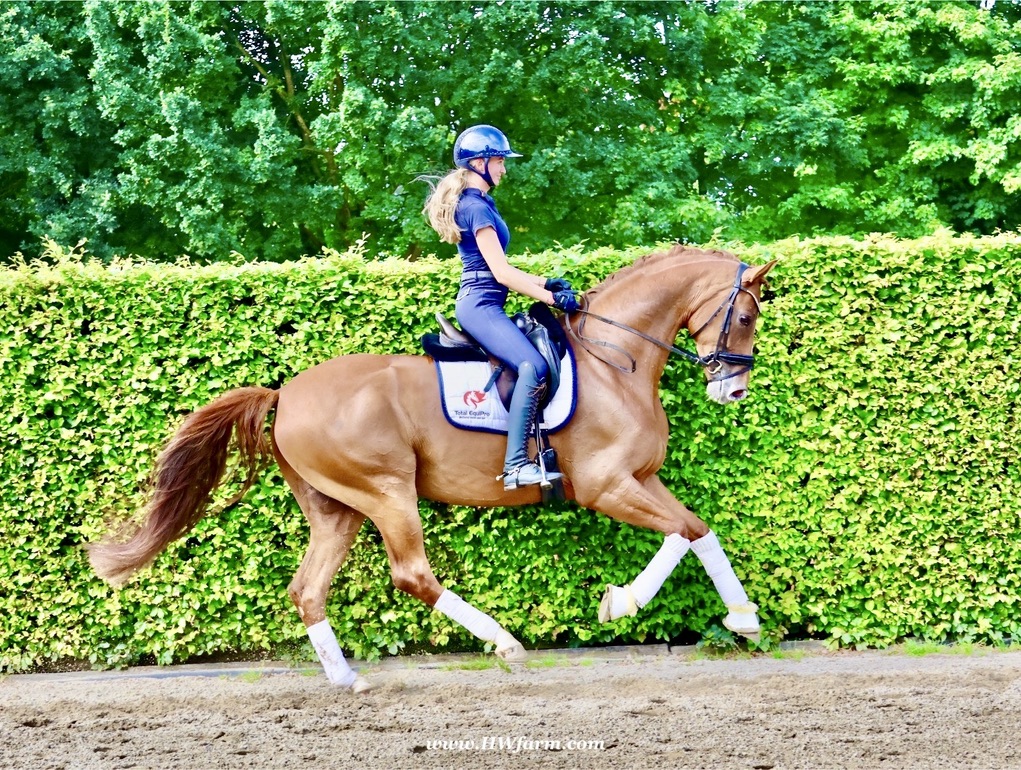 Sky HW is by the famous stallion Springbank II VH, whom is an expressive young horse with fantastic, loose movement and a ground-covering stride. He has a lot of power, a very quick hindleg, and a lovely head and neck. He is a full brother to Springbank who was very succesful at the world championships for five-year old horses. He is elegant and has an impressive exterior. He has exceptional qualities in his gaits and emphasis on fundamental correctness in movement.At his Danish Warmblood licensing in 2017, Springbank II VH was named Premium and he was the winner of his 14-day test in Denmark. He also won the 2017 Danish Warmblood 35-day performance test scoring a total of 954.5 points. Springbank II VH never scored below 9 and received a 10 for rideability.In 2018 Springbank won the Swedish Breeders Trophy and his rider Charlotte Dujardin gave him much praise saying she could not find a single weakness in him during their ride. She continued to say, “I can’t think what more I could want from him aged four: he has the ability to go and come back, he has power and balance and suppleness, he’s an absolute dream in the contact. There’s nothing I would change and I’m very jealous that I have to give him back…You always wonder what these stallions will feel like to ride, whether it feels as good as it looks and with him it does. Talk about putting a smile on your face — not even chocolate cake can make you feel this good!Sky HW’s dam sire is Fidermark, one of the key players in the dissemination of the F line blood of the Selle Français import, Furioso II – and this F line is one of the most important in dressage to-day. Taking a look at the top 20 dressage stallions in the 2021 Hanoverian Stallion book, we find seven descend from Furioso II, all of them via his grandson, Florestan (Fidelio / Rheingold), with two more sitting in 21st and 22nd. Fidermark is himself the sire of the 17th ranked For Complement, while one of the very hot competition and breeding stallions right now, Foundation, is by the Fidermark son, Fidertanz, and Fidertanz himself occupies 22nd place on the Hanoverian rankings. Right from the start, the Florestan son, Fidermark was a star. He was the reserve champion of the 1994 Westphalian Stallion licensing, and then the following year, was the winner of the Performance Test with 141.74 points at Warendorf, and the year after that he won the four-year-old stallion class at the Bundeschampionate. He achieved all this with the Westphalian state stud rider, Michael Farwick. When some of the Westphalian stallions went to train with German dressage trainer, Johan Hinnemann, the ride on Fidermark was given to the 23-year-old Dutch rider, Marlies Van Baalen, daughter of Coby van Baalen, a long time rider with Hinnemann. It was about this time that the joke went round, what do the letters, NRW (the correct abbreviation for the breeding area North Rhine-Westphalia) stand for? Netherlands Riding Westphalians, came the answer… Fidermark’s dam, Watonga is by the Hanoverian ‘trot maker’ Werther. Mated with Power she produced Palegro, a licensed stallion who represented Westphalia at the German Show jumping championships. With Marlies van Baalen in the saddle, Fidermark qualified for the 2000 Nürnberger Burgpokal Finals, and went on to compete at Grand Prix level. Fidermark died in August 2003 but in his way-too-short period of time at stud, produced an astonishing number of excellent progeny – stamping himself as the best son of Florestan.Fidermark produced 39 licensed sons, including Fürst Piccolo, the Westphalian licensing winner in 1999, and performance test winner the following year and Feinsinn, who topped the performance test in 1999 (and with Carolin van der Linde, was a member of the German Gold medal winning team at the 2006 European Young Riders Championship). The Hanoverian branded Falsterbo has started competing in Grand Prix dressage after successful appearances on the small tour. Despite attracting a relatively small number of mares, Falsterbo entered the Hanoverian dressage stallion top rankings in 2008, with a dressage index of 120. Falsterbo was sold to the United States where he died in 2012 but he left behind in Germany, Dorothee Schneider’s up-and-coming Grand Prix competitor, Faustus, he was added tot he German Olympic squad in 2019. Another son, Fiano won the 2002 performance test with one of the highest indices ever – and then there are the four Farewell brothers. Farewell I was licensed in 2000 and since then has produced four li-censed sons; Farewell II, was the Premium stallion in 2001; Farewell III won the 2007 Six Year old dressage championship at the Bundeschampionate, after being 2nd in the 3 year old stallion class, 4th in the Four year olds, and a finalist in the 5 Year Old Dressage class. Farewell IV was licensed in 2003; Fidertanz won the 2004 Westphalian stallion licensing, and then the performance test, and was reserve champion at the Bundeschampionate. Fidertanz was also just named Hanoverian horse of the year 2021!
