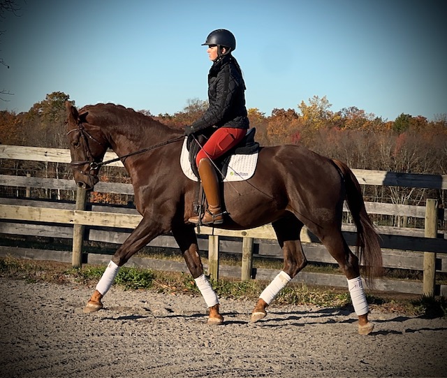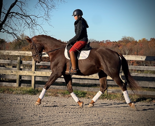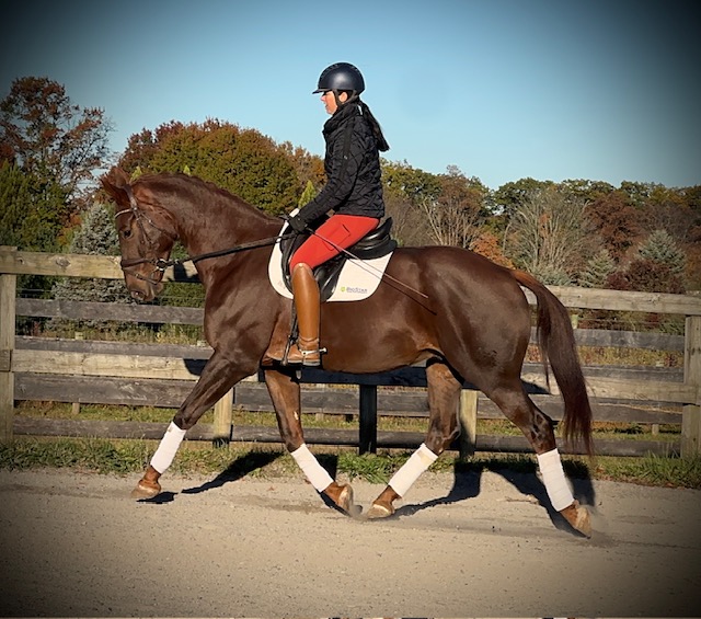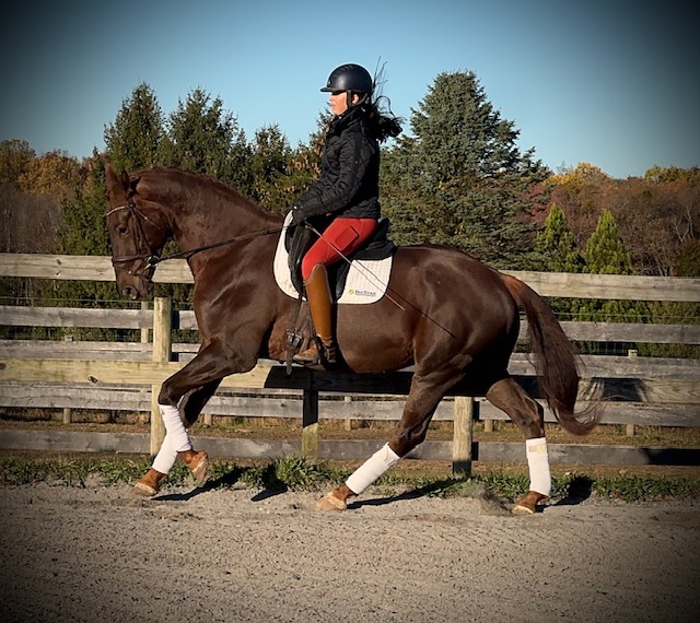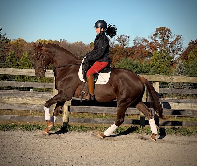 ‘Rambo’ is a well started classy young horse with potential for the highest levels of dressage. He is US bred and was started under saddle earlier this year. He has been ridden both indoors and outdoors and is straightforward and uncomplicated both on the ground and under saddle. He’s ready to begin his show career with his new partner. Rambo is forward thinking without being hot or spooky or overly reactive. He’s a pleasure to have in the barn. Rambo is a mild cribber which is controlled with a collar. He has not been destructive in any way.
